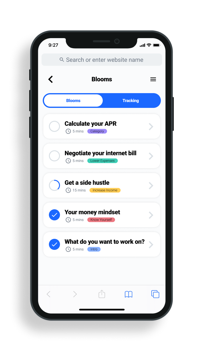 Bloom asserts that financial wellness is primarily driven by good financial behavior, and seeks to empower users to establish good habits through practice exercises.